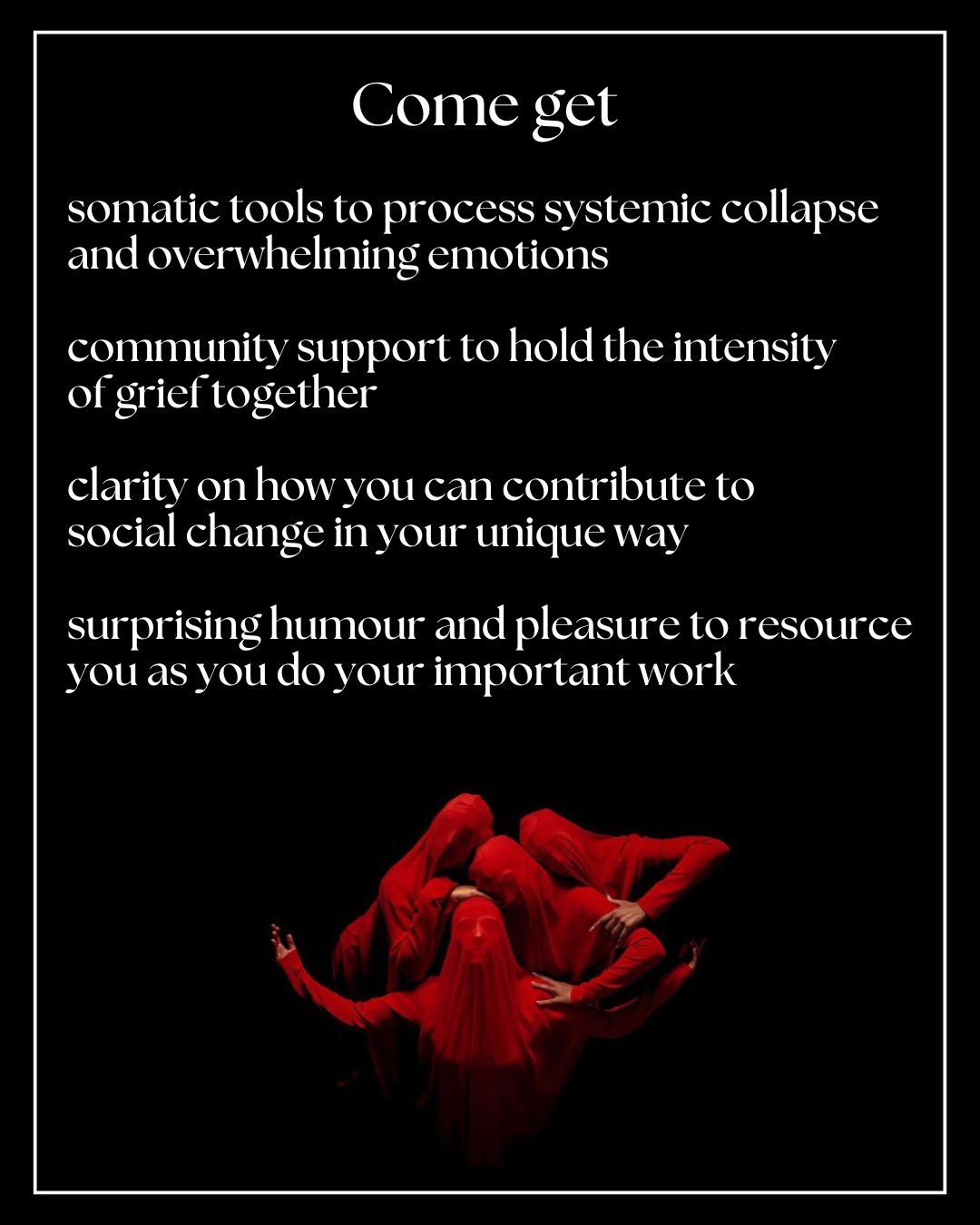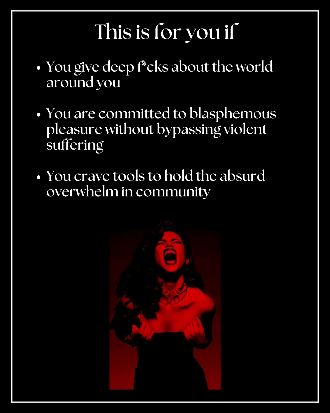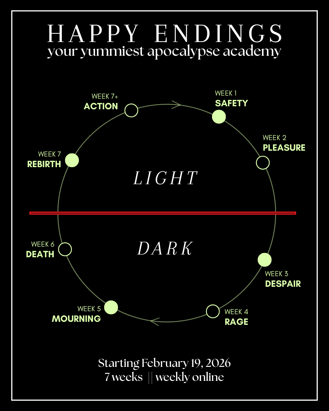 HAPPY ENDINGS is where we gather to develop the capacity to hold grief with pleasure, as blasphemous as that may sound. We are not here to manifest our way out of worldwide system collapse. We train to feel fully, grieve deeply, and stay alive to joy even as we experience what sometimes feels like the end of the world.